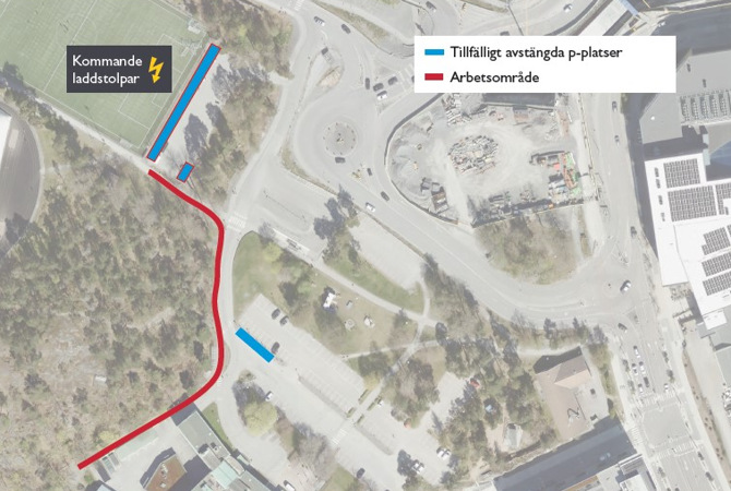 24 november – 7 december (vecka 48 och 49) monteras laddstolparna vilket innebär att parkeringsplatserna närmast fotbollsplanen inte kommer att vara tillgängliga under den här perioden.