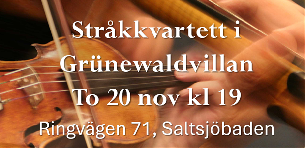 Vi spelar stråkkvartetter av Tor Aulin och Kurt Atterberg i Grünewaldateljén den 20/11 med start klockan 19. Det blir en dryg timmes musik. Fritt inträde.