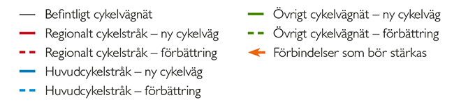 Översiktskarta av det befintliga cykelvägnätet samt föreslagna åtgärder