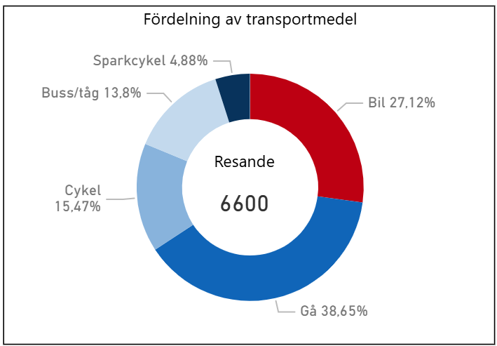 Den senaste resvaneundersökning från 2025 och vecka 21 i slutet av maj ser ut så här. Elva skolor deltog. Eleverna fick varje morgon under veckan svara på hur de tagit sig till skolan.