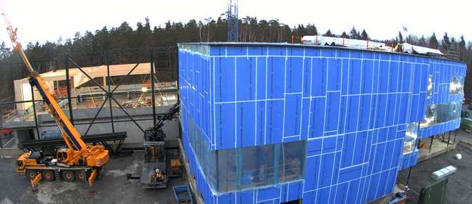 Stålstommen och bjälklaget som ska bära upp entrén, receptionen, cafét och omklädningsrummen byggs upp under hösten, därefter monteras yttertak och väggar av prefabricerade element.