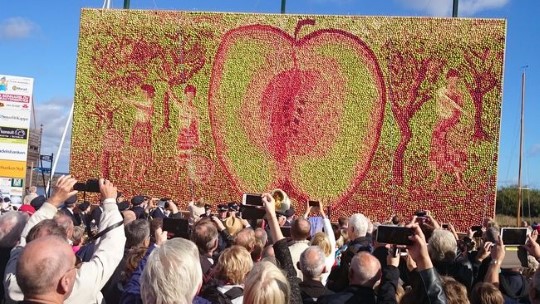 Tomtebloss/Lägereld höst. Tillverkning av stor ”Äppeltavla” parallellt med en lokal variant av ”Grillmästarna”. Syfte att väcka uppmärksamhet och sätta energi på/i de sociala rum som planeras i området.
