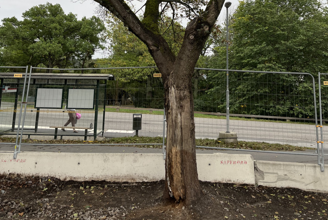Skadan är inte kopplad till det pågående vägbygget i området utan var redan identifierad innan projektet startade, projektet har haft uppsyn av trädet men nu dömt ut det.