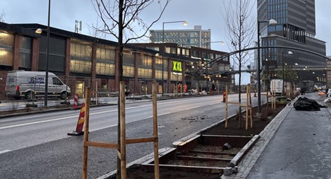 I det mörka decembervädret är ett grönt arbete längst med nya Värmdövägen i full gång. Just nu planteras ett imponerande antal träd, buskar och perenner som kommer att ge området både grönska och liv.