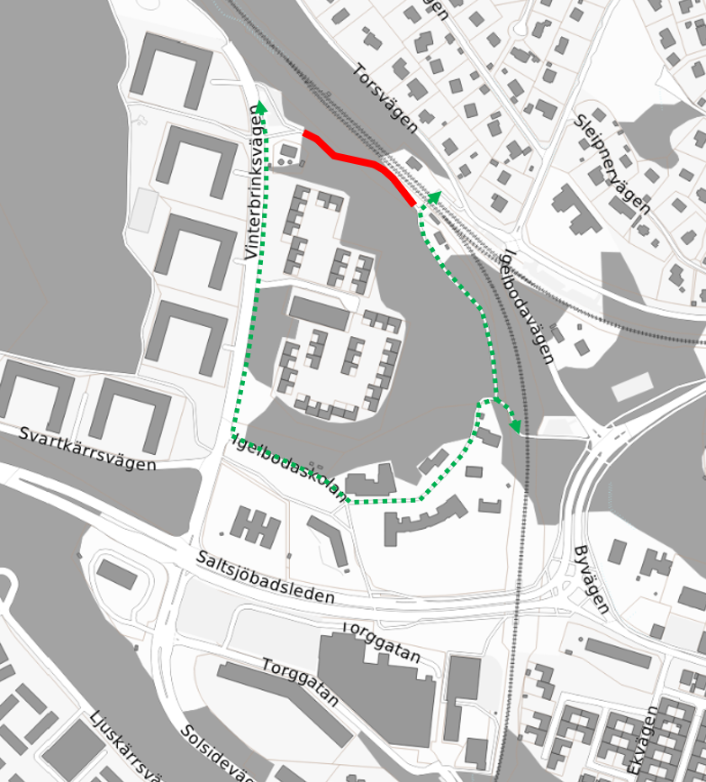 Karta över arbetsområdet i Igelboda. Grön streckad linje betyder begränsad framkomlighet för gång- och cykeltrafik. Röd linje betyder avstängd gång- och cykelbana.