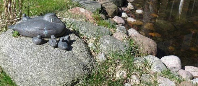 Invid dammen, på en av de större rundade naturstenarna ruvar en ejderhona av brons med sina fem ungar. De ligger där, gjutna i naturlig storlek och blickar ut över vattnet. Andra stenar längs vattenbrynet är beprydda av insekter som trivs vid vatten, de är huggna i så kallad halvrelief direkt i stenen. Tanken är att dessa ska utgöra detaljer i trädgården. De bjuder på upptäckter för den som pysslar i planteringarna, tar en promenad eller njuter av en fika på den lilla terrassen invid dammen.