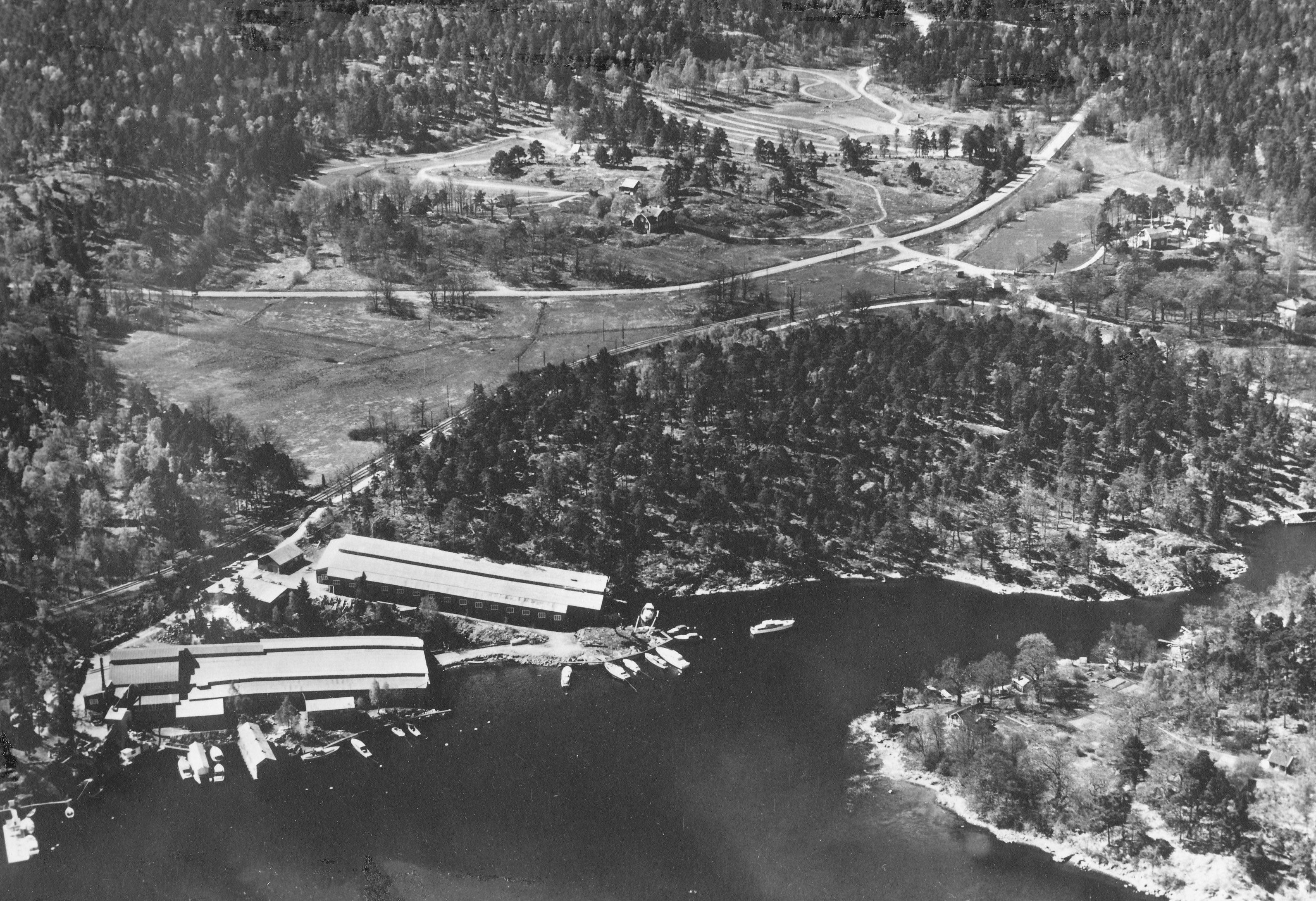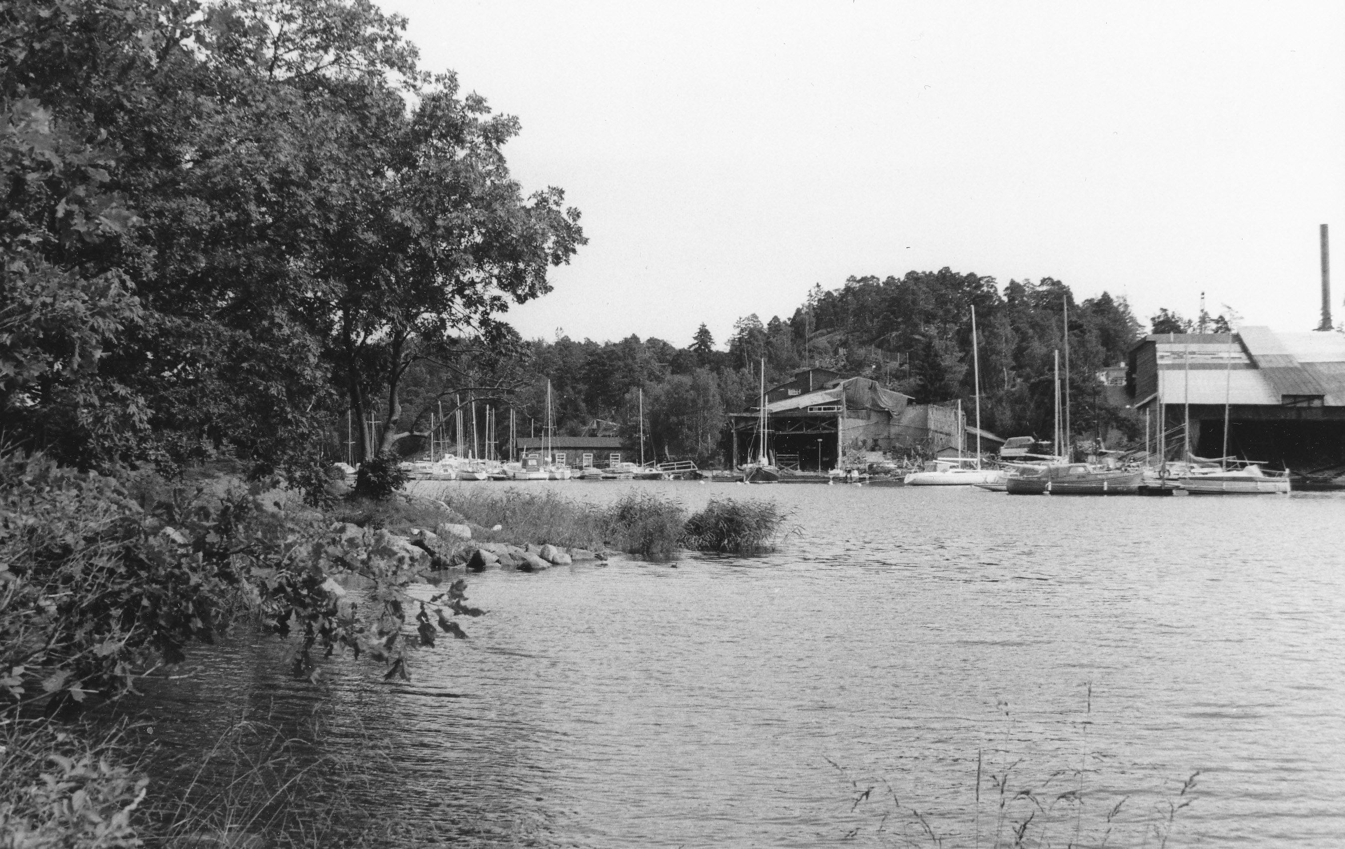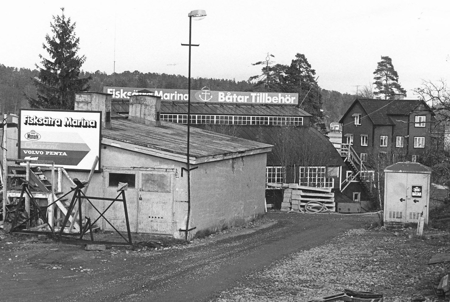 Den än idag verksamma Fisksätra Marina härstammar från år 1919, när Axel Larsson grundade Fisksätra Motorbåtsvarv. När bilden togs fanns redan planer på den utbyggnad som kom att ske många år senare. Foto 1982.